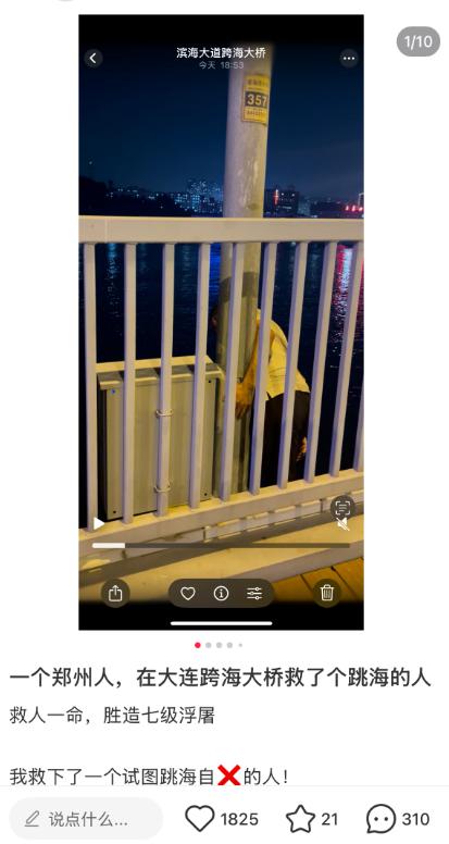 10 月 6 日,有网友在社交平台发帖称,10 月 4 日晚吃完饭到星海湾大桥散步时,突然遇到一名准备跳海的中年男子,经过她和朋友的劝说,成功劝回了这名男子。