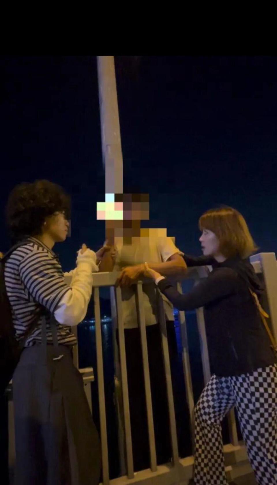 胡女士说,她和朋友无法将中年男子拉上来,只好用言语对他进行劝说," 你有什么想不开的可以和我们说说,没有什么过不去的 "" 你要是想喝酒,我们从外地来的可以陪你一起喝 ",中年男子回应道:" 你们当真吗?" 胡女士和朋友马上给予了肯定的答复,这才把他从栏杆外拉了上来,整个过程仅仅过去了约 8 分钟的时间。
