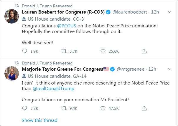 2020 年,特朗普被挪威议会议员提名诺贝尔和平奖,理由是参与斡旋以色列与阿联酋关系正常化。对于这件大喜事,特朗普非常兴奋,他先是转发了自己获提名的新闻,并配文说 " 感谢 ",之后又连转了 15 条与此有关的新闻以及向自己表示祝贺的推文。
