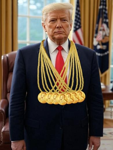 有美国网友在 X 平台发布恶搞图,图中特朗普的脖子上挂了七枚诺贝尔和平奖章。