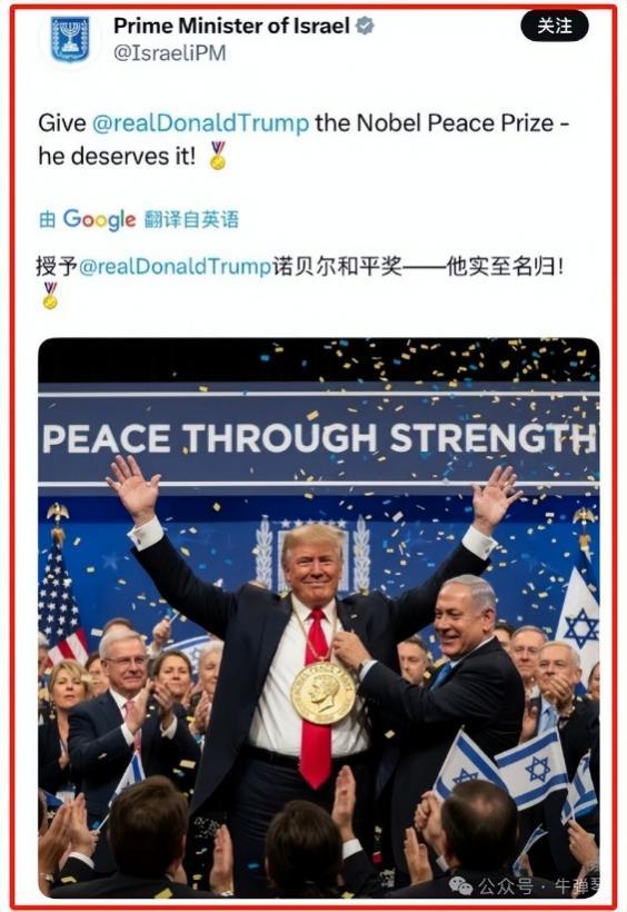 以色列投其所好,为特朗普 " 最后一搏 "。9 日,以色列总理内塔尼亚胡在 X 平台发布了一张显然经过后期处理的照片。照片中,他正将一枚巨大的诺贝尔和平奖奖章挂在美国总统特朗普的脖子上。并写道:" 这是他应得的!"