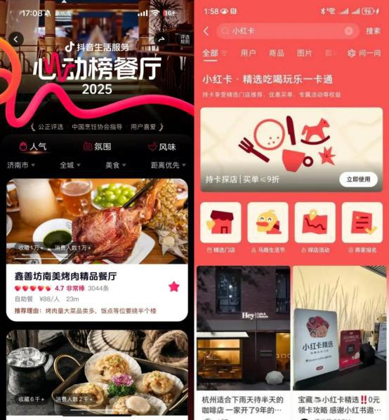 内容平台也在悄然布局。抖音生活服务发布了 " 心动榜 ",覆盖餐饮和酒旅两大领域;小红书则在三城推出 " 小红卡 ",持卡用户可享受 " 精选门店推荐 "、" 全店通用折扣 " 等权益。