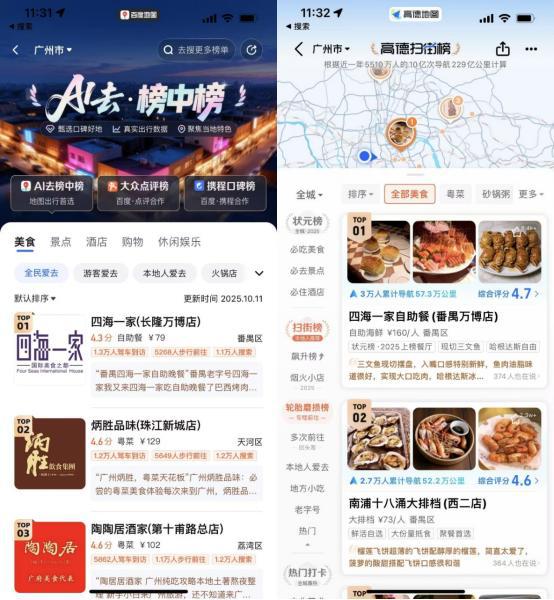 阿里、美团、抖音、小红书纷纷出招,都试图以 " 榜单 " 重塑消费者的到店心智。高德率先推出 " 扫街榜 ";美团则联合百度地图、携程火速迎战,上线 "AI 去 · 榜中榜 "。