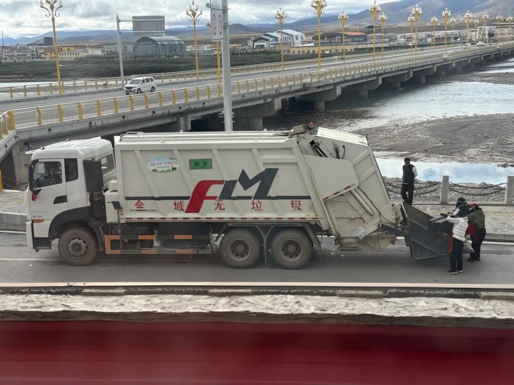 ▲9月20日10时许,一辆载重25吨的压缩垃圾车驶过治多县主街道,居民听到熟悉的《兰花草》旋律,纷纷出来倒垃圾。新京报记者 丛之翔 摄