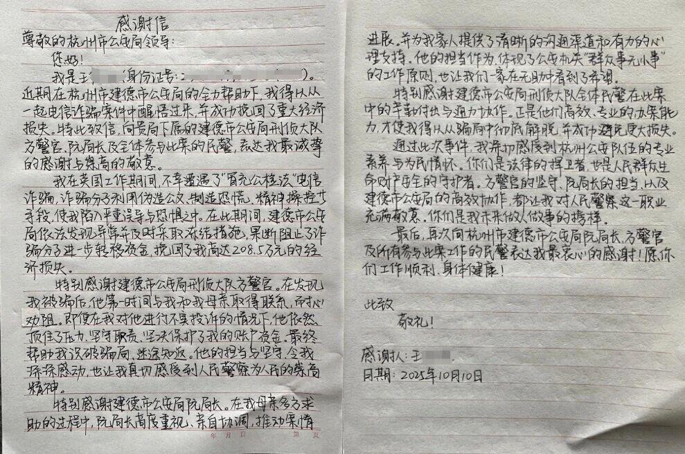 几天后,王女士从老家黑龙江寄来一封亲笔道歉信,并多次致电建德市公安局警务督察大队,郑重请求为方建华澄清正名。她在电话中说道:" 我投诉的,是一位最负责、最替我着想的民警。我用最恶意的心态,揣测了他最善意的行动。方警官保护的不仅是我的钱,更救了我全家。我的投诉,是他职业生涯里的污点,我恳请组织为他擦去,还他清白!"
