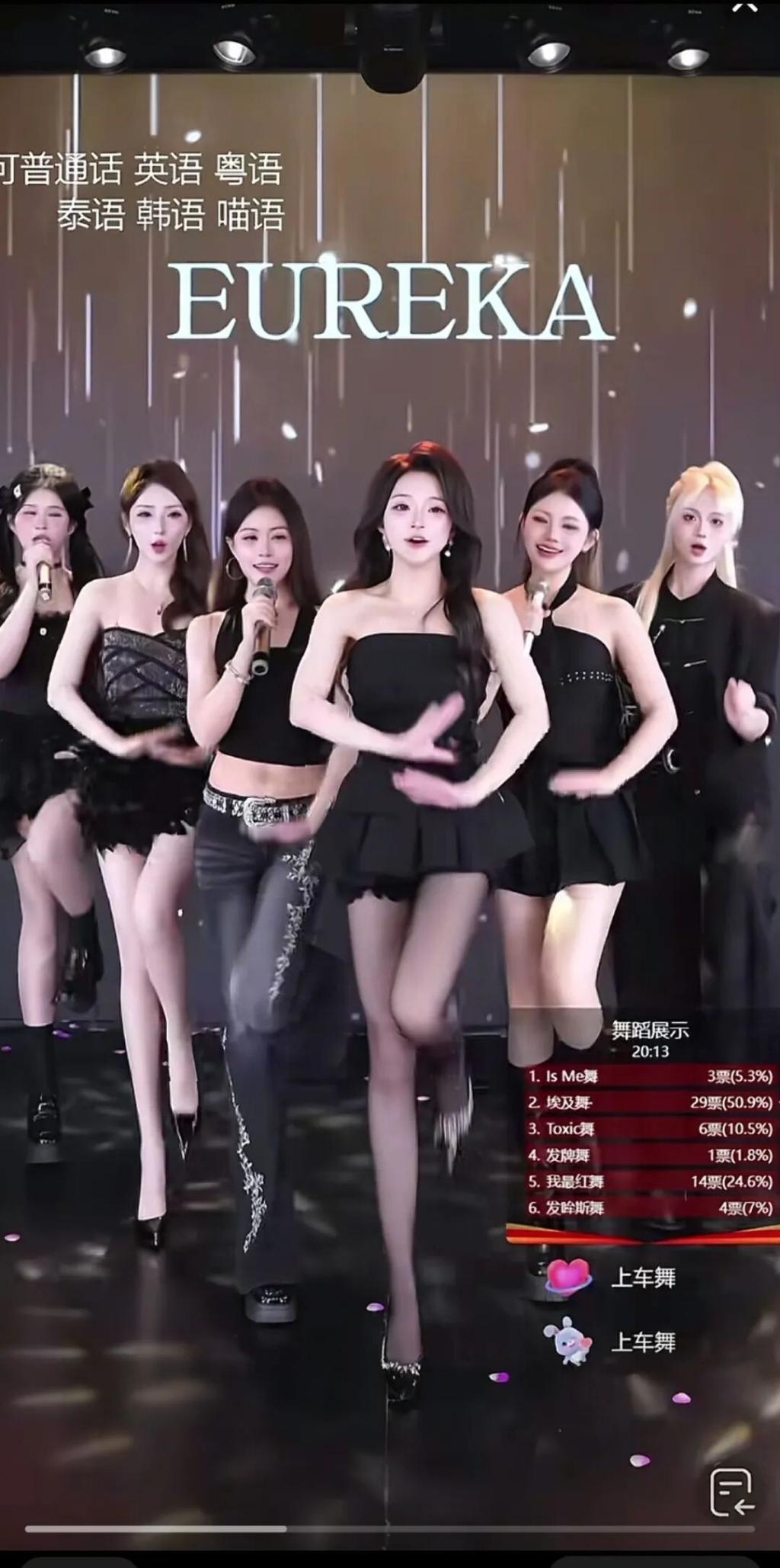 Eureka 直播间里,由 C 位程艺领衔,剩下六位成员跟跳,旋律欢快的汽车喇叭配乐响起,上车舞开始了。
