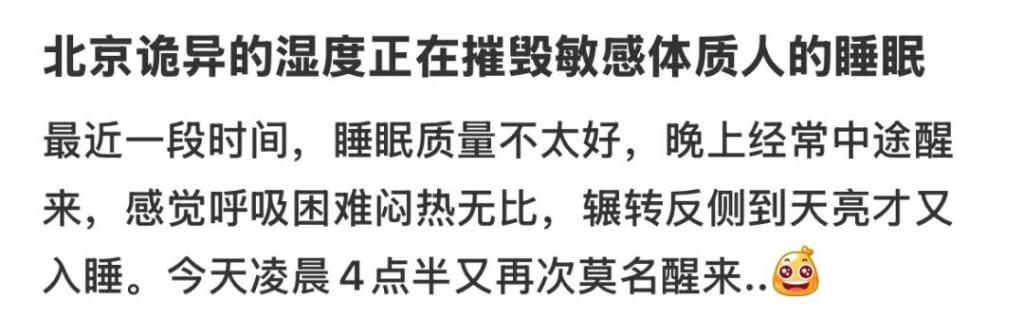 这种湿冷的气候,让很多土著北京人都感到无法适应,甚至睡不着觉。今年 40 岁的北京人姚小花,说自己睡觉时对于空气温度和湿度的变化特别敏感。最近一段时间,因为空气湿度太高、温度又太低,就根本睡不踏实。