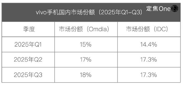 这次轮到 vivo。根据 Omdia 和 IDC 的数据,vivo 以 18% 左右的市场份额重返榜首。华为与苹果则在 15-16% 的区间内争夺第二、三名。