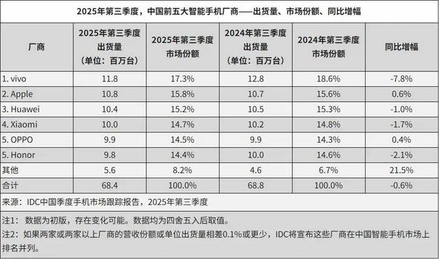 2025 年第三季度,中国手机市场同比下降 3%。根据 Omdia 分析师的观点:" 年初国补带来的阶段性出货波动正在消退,市场节奏逐步回归常态。" 在这样的市场环境中,vivo、苹果、华为用不同的方式,守住了各自的市场份额。