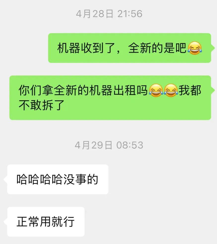" 有一次,商家给我寄来了一台全新的、没拆封的设备,我都有点担心 ",她拍了全流程的视频发给商家,得到对方 " 可以正常使用 " 的回答,才敢拆开包装。