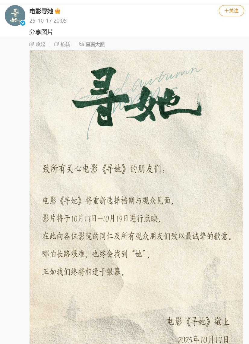 片方公告表示,电影《寻她》将重新选择档期与观众见面。影片将于 10 月 17 日至 10 月 19 日进行点映。" 在此向各位影院的同仁及所有观众朋友们致以最诚挚的歉意 "。