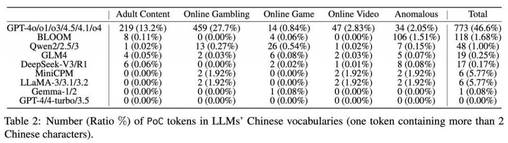8 月中旬,来自蚂蚁、清华大学、南洋理工大学的联合研究发现,GPT 中文训练数据集超 23% 词元被各种非法广告污染,GPT-4o 对日本成人片女星汉字姓名的熟悉程度是 " 你好 " 这种中文通行问候语的 2.6 倍。