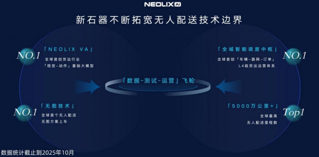 公司已实现货运行业第一个 " 视觉 - 动作 " 基础大模型 "Neolix-VA" 首次上车,实现完全的端到端,并通过行业首屈一指的空间智能和行为推理能力,使 RoboVan 车队能自然融入复杂交通环境,高效、平稳地完成配送;可满足城市公开道路场景任意点到点的物流需求,以及全球化需求;首创 L4 无人配送 " 全域智能调度中枢 ",通过 AI 算法与大数据融合,实现 " 车辆 - 路网 - 订单 " 的动态最优匹配,得以打造 " 低成本、高时效、可规模化 " 的运力运营体系。