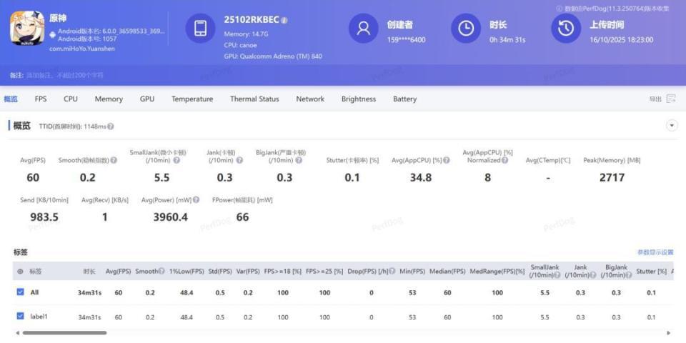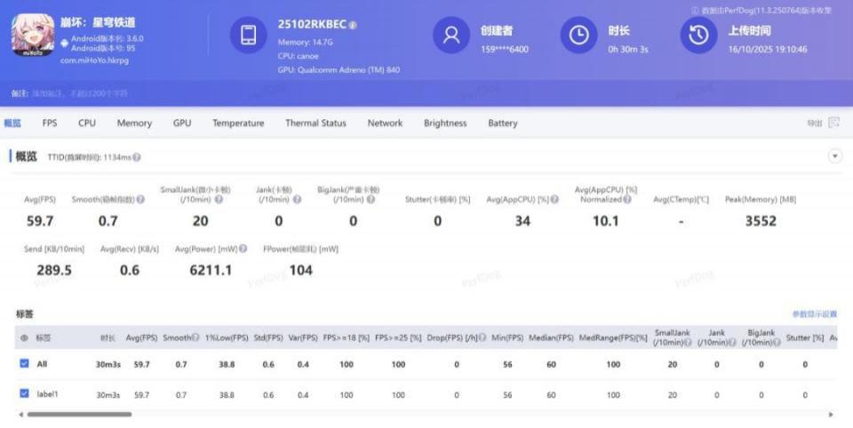 而压力更大的崩坏:星穹铁道 - 黄金的时刻跑图,则是以 6.2w 的功耗跑出了 59.7 帧。