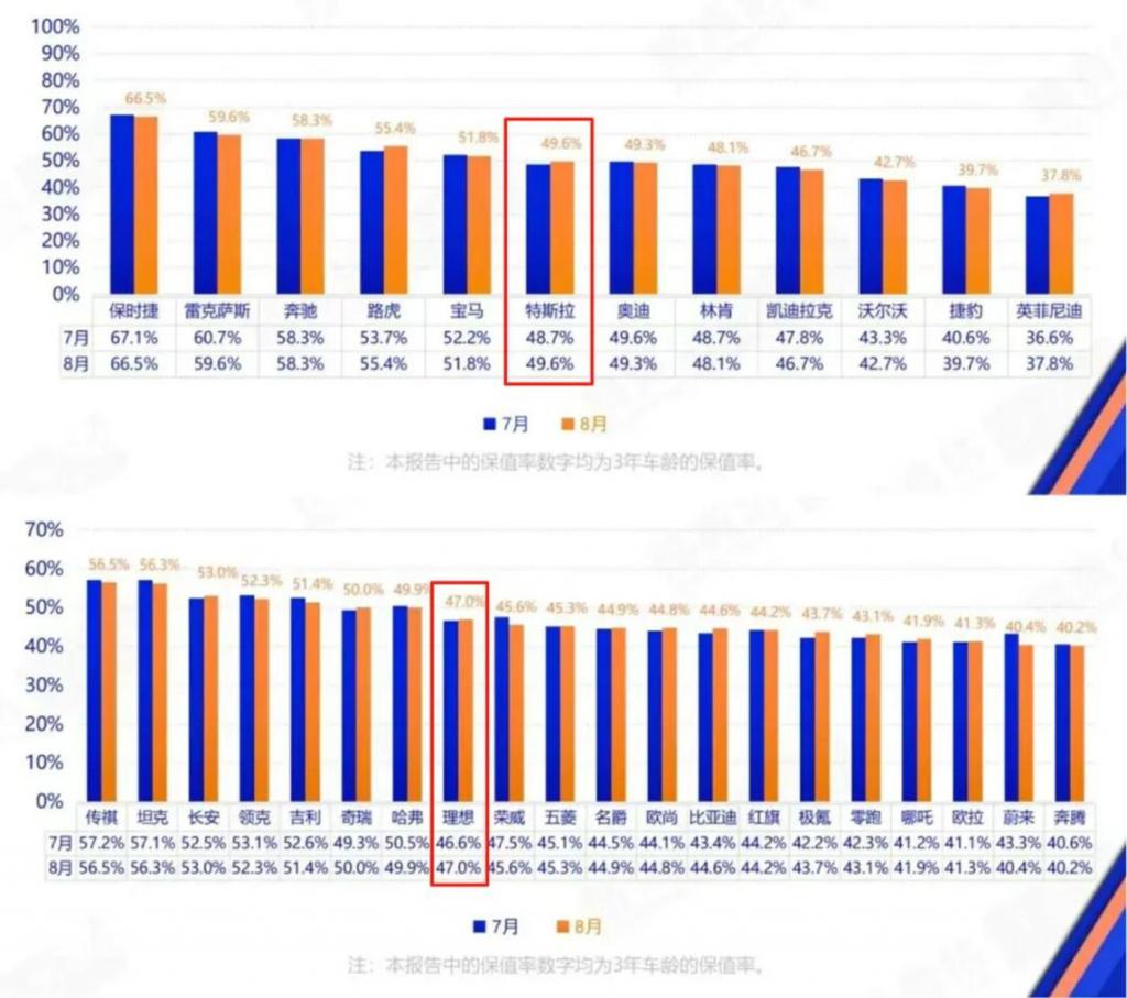 中国汽车流通协会最新数据显示,8 月,特斯拉的三年保值率为 49.6%,环比微涨了 0.9 个百分点;理想的保值率为 47%,环比微涨了 0.4 个百分点。这些数据为销售人员购车提供了重要的信心保障,毕竟车辆的保值能力直接关系到他们的资产配置。