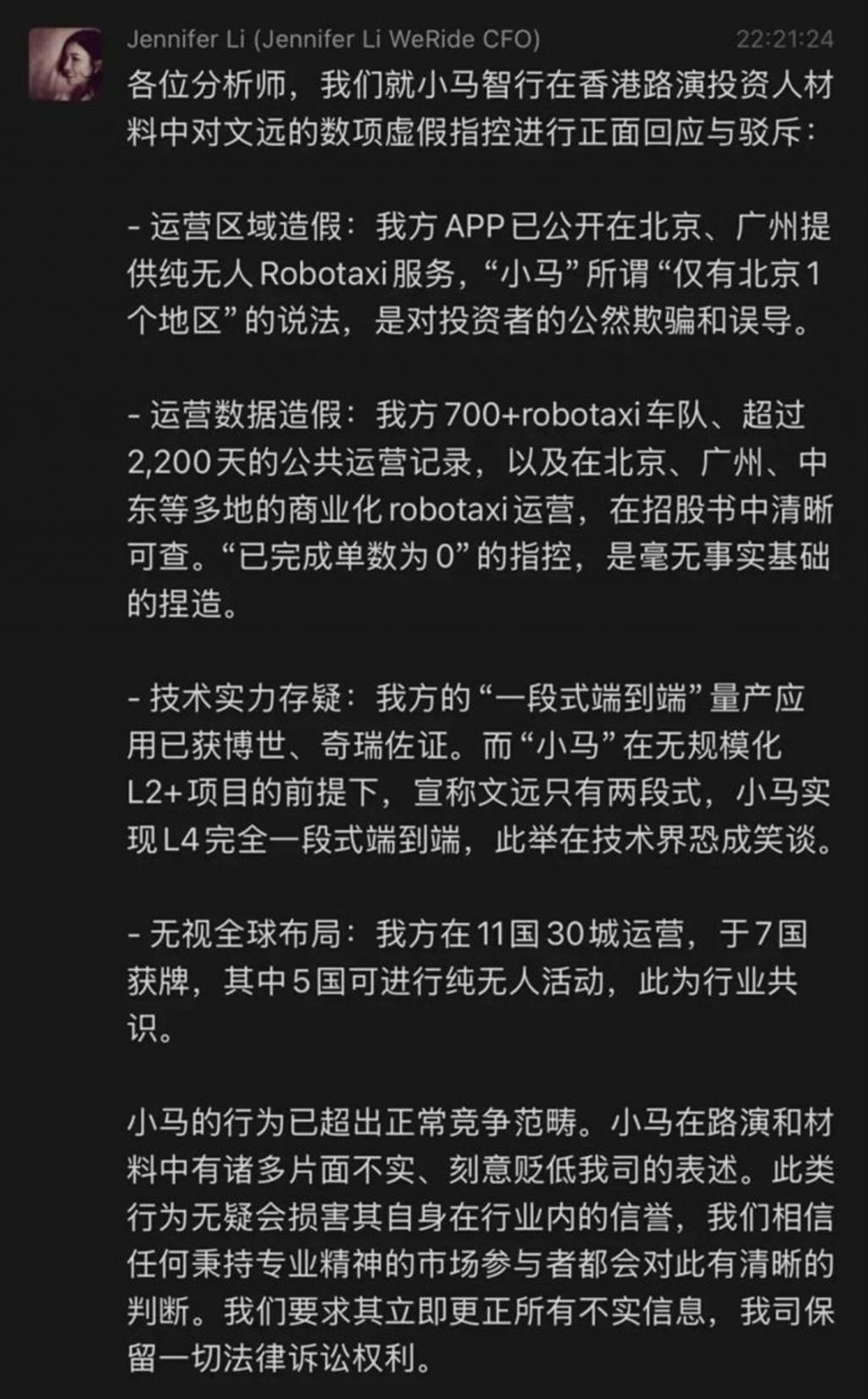 10 月 30 日晚,文远知行 CFO 李璇在某分析师群中 " 炮轰 " 小马,正面回应了上述 " 指控 ",并表示这一行为 " 已超出正常竞争范畴,我司保留法律诉讼权利 "。