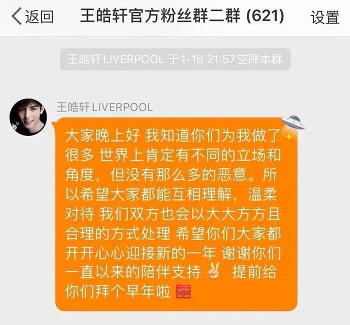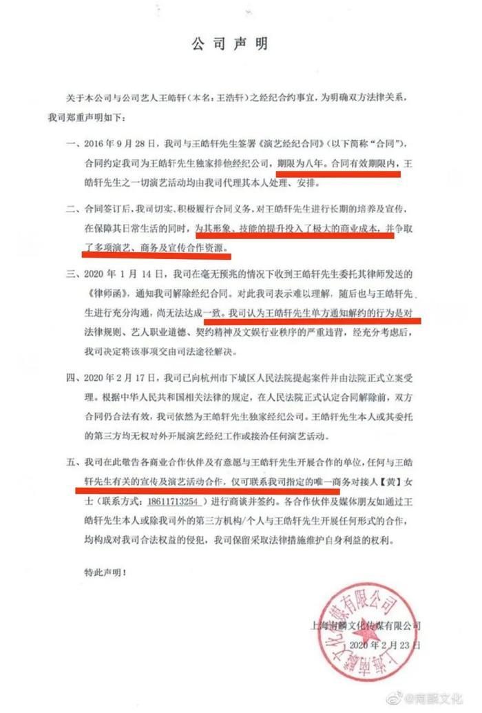 2020年1月17日,王皓轩发微博称已发律师函通知经纪公司——上海南麟文化传媒解约,