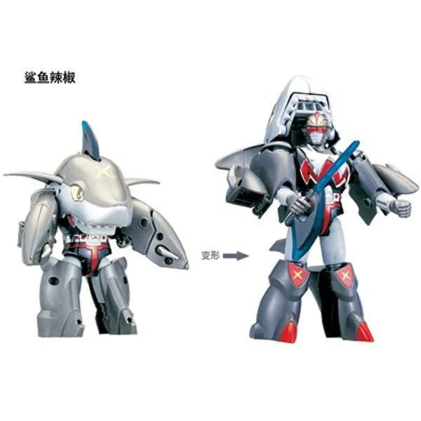 九号机是鲨鱼辣椒:以鲨鱼为原型,高原寺博士为他编写了特殊程序,是高原寺制造的最强的机器人,但他学会了人类最黑暗的一面。加上他本身力量强大和拥有鲨鱼辣椒巨人所以到处搞破坏。于是便被高原寺给封闭起来、并在脸上刻了x,后来因为丸子龙的偶遇意外的把他救出来。被救出后他非但没有改正错误还变本加厉的利用丸子龙等人简单的头脑达到自己的邪恶目的。大结局卡布达利用和平星把他脸上的疤给消除了从此改邪归正。变身时间所有机器人中最多的有15分钟。