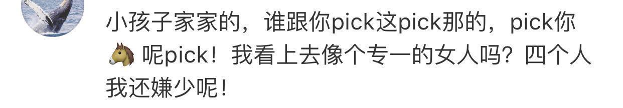 有营销号发微博问参加《歌手》的四人中pick哪个,粉丝这么回答:我看上去像个专一的女人吗?四个人我还嫌少呢!