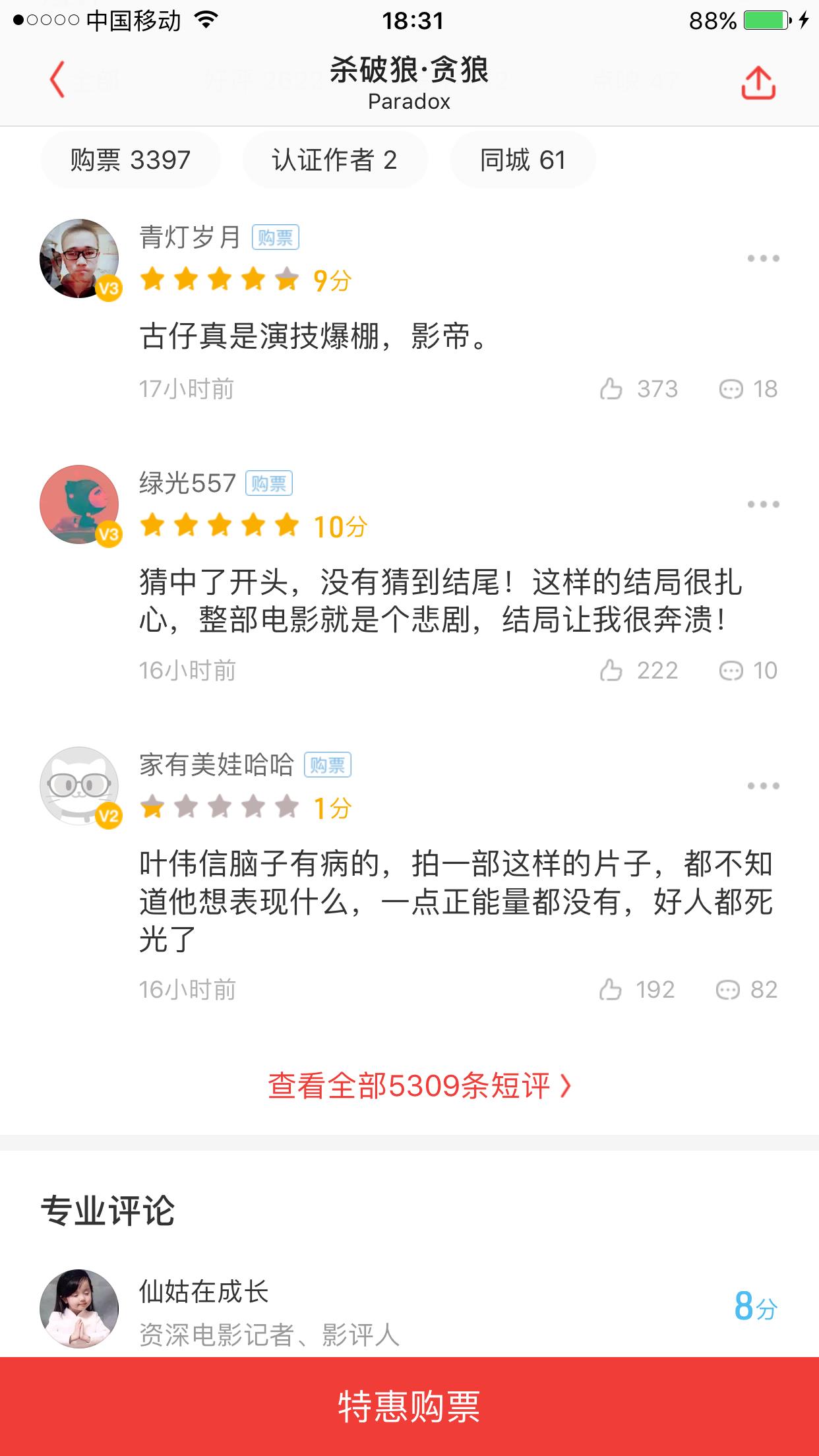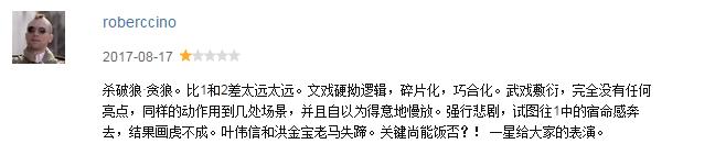 和豆瓣打分较高的评论不同,在猫眼影评中,还是有部分观众对这部电影表示了不满,原因是《杀破狼3》是一个悲剧式的结局!