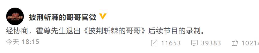 或许迫于网友和舆论的压力下,《披荆斩棘的哥哥》节目组发布了一段声明,说经协商,霍尊先生退出《披荆斩棘的哥哥》后续节目的录制。