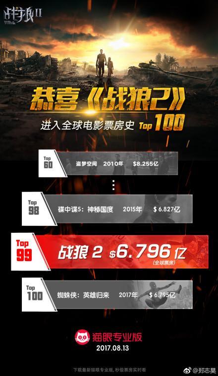 根据猫眼专业版实时票房数据显示,《战狼2》在8月13日18:59累计票房45.06亿人民币。根据BoxOfficeMojo票房数据显示,全球票房排第99名的影片为《蜘蛛侠:英雄归来》,全球票房为6.79亿美元(换算成等值人民币约为45.22亿)。
