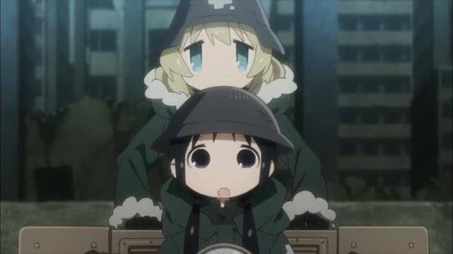 两人漫无目的的驾驶着履带车,行驶着,动漫中的季节是冬季,两个萝莉穿着厚厚的衣服,带着小钢盔,各处寻找食物,没有目的,也没有终点。