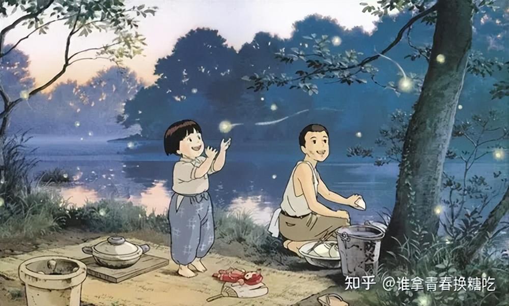 由高畑勋执导的《萤火虫之墓》改编自以第二次世界大战为背景的半自传小说,其开头便为倒在车站柱子旁饿死的少年清太,再以倒叙法带着观众回到过往,看到清太兄妹因父亲被军队征召,罹患心脏病的母亲又因空袭轰炸而伤重致死,所以他们只能躲在防空洞内相互扶持,最后在没有足够食物和休息环境的情况下,兄妹两人相继离世。