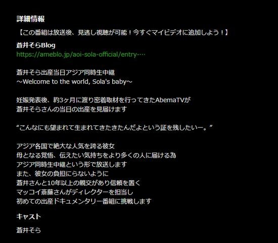 据了解,在苍井空宣布怀孕后,Abema TV进行了约3个月的关注并取材。苍井空表示,想把为人母的心情和觉悟传达给更多的人,于是决定在亚洲同步生产过程。同时,为了不让准妈妈有负担,深受苍井空信赖的十年好友斎藤将担任导演,初次挑战生产纪录节目。