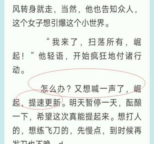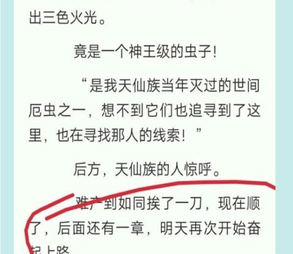 这个是在辰东写到《圣墟》的楚风进入到太上的山脉的时候写到的。自己如同挨了一刀,至于挨了谁的刀,辰东没有说,这个理由太搞笑了吧。但是后面说到明天开始奋起上路,很明显辰东的意思就是说开始恢复更新了。但是这样的节奏代表了什么别人或许不知道,但是看过《圣墟》的读者都是知道的。也正是说完这句话,七天两更新的节奏,变成了7天一更。