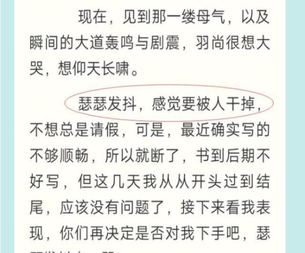 说到辰东的这一次拖更,那是瑟瑟发抖啊。为什么呢?因为辰东说到自己请假太多了,害怕读者吐槽。于是说到最近的剧情不够顺畅,于是理顺成章的,断更了啊。后面又说到了自己从头到尾看了一篇,《圣墟》的剧情应该是没有问题的了,紧接着说到看他的表现在是否绝对对他下手。其实大家也都知道。这一次辰东说要看自己的表现,后面应该又是要拖更了好久的。