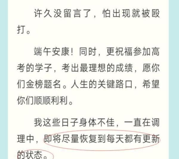 看到辰东说到的即将尽量的恢复每天更新这样留言,很多的读者都是非常的高兴啊。但是耐心却是在等待中消失了。怎么说呢?这个即将和尽量,是从6月的7号一直到如今的二十多号了,还是没有更新。很明显这符合辰东的风格。每一次说要更新,那么意味着将要打破之前的拖更记录了。没错,说这句话之前还是十天一更,如今二十多天还没有更新,真的“神了”,辰东这个规律被读者掌控了。