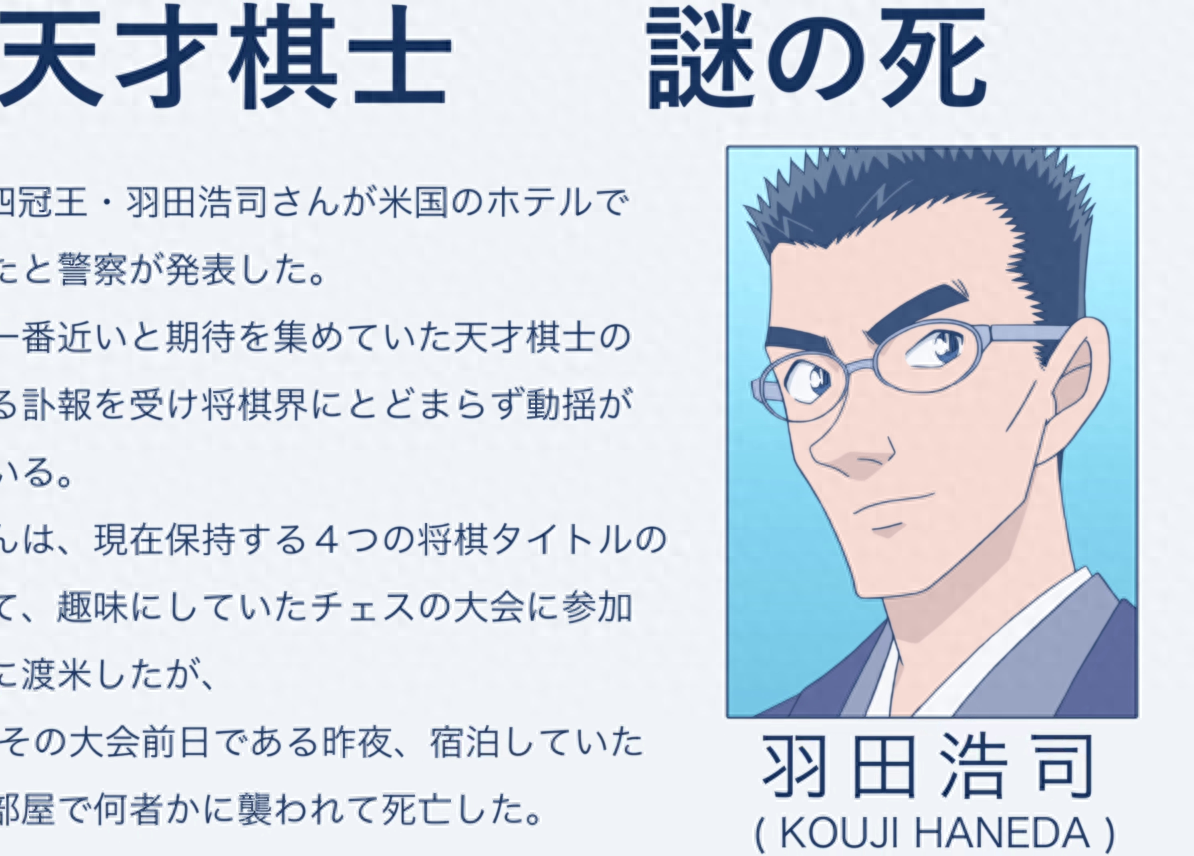 时至今日,羽田浩司案的秘密还没有全部解开,诸多疑点依然存在。比如:羽田浩司案现场的那份英式下午茶是否表示现场还有英国人?黑田兵卫和若狭留美好像对羽田浩司案十分关心,这两人在其中扮演了什么角色?羽田浩司案发生后,有人在网上定期上传案件资料,这个上传者又是谁?