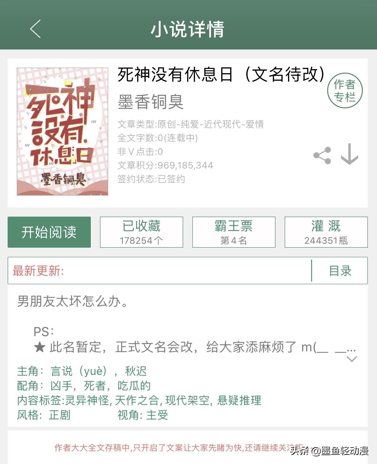 目前墨香大大安心在家写老四,相信不久《死神没有休息日》就会和大家见面了。