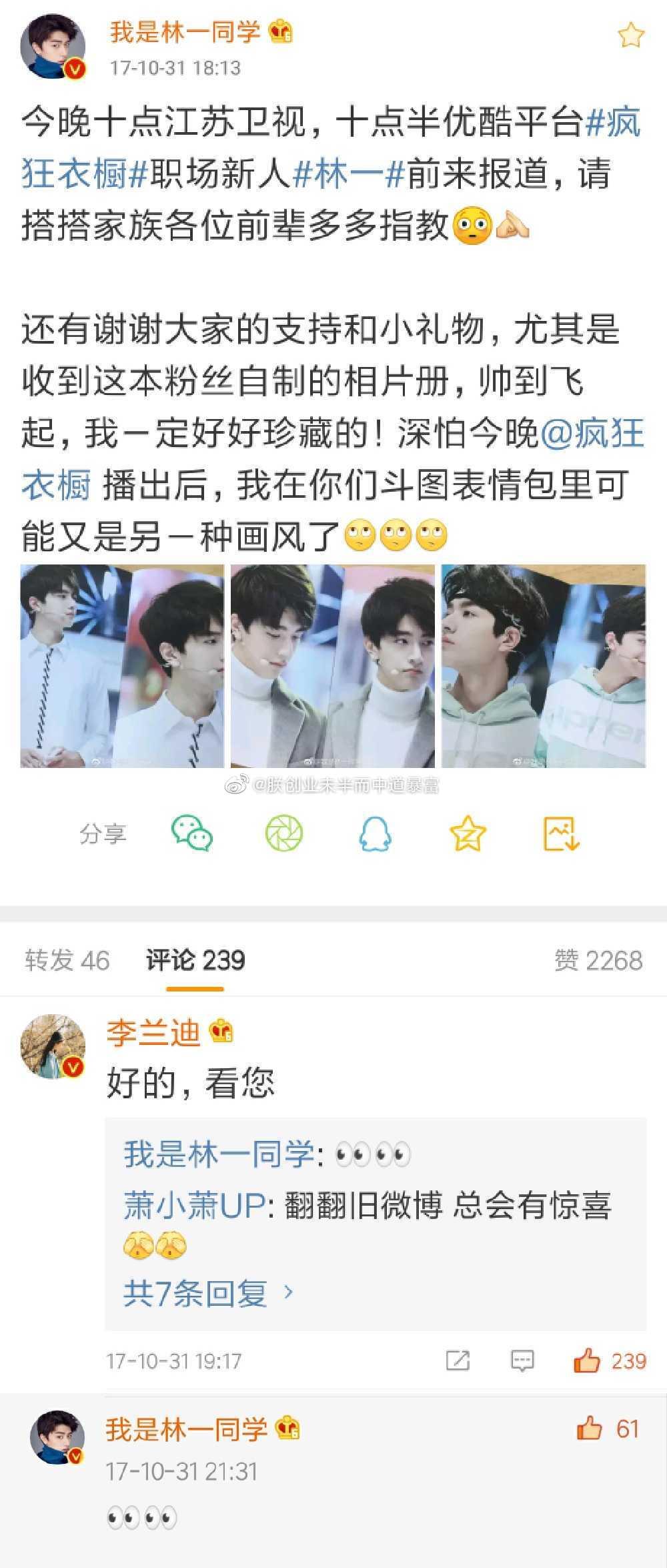 近日,有媒体爆料林一、李兰迪将合作《许个愿吧,大喜》,早在之前林一还试镜过林扬,两人平时在微博也有很多互动。