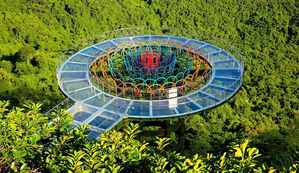 你还可以在全海景玻璃栈桥上行走,仰观天高云阔,俯视逾百米深的雨林山谷。