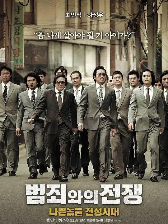 首先是由尹钟彬执导的电影《与犯罪的战争:坏家伙的全盛时代》。该片以1990年时任韩国总统卢泰愚发布“要与犯罪和暴力进行战争“的10.13宣言为背景,讲述了当时釜山警方在扫荡犯罪势力的过程中,发生的充斥着血腥与暴力的故事。该电影于2012年上映。崔岷植、河正宇、马东锡、赵镇雄 、郭道元、金成钧等领衔主演,演技非常出色。接下来是由金成洙执导的电影《阿修罗》。该片于2016年上映,由郑雨盛、黄政民、朱智勋、郭道元、郑万植主演。影片讲述了在这个地狱般的世间里,为了生存而展开血腥厮杀的恶人们身上发生的故事。影片画面十分震撼,场面极具紧张感。