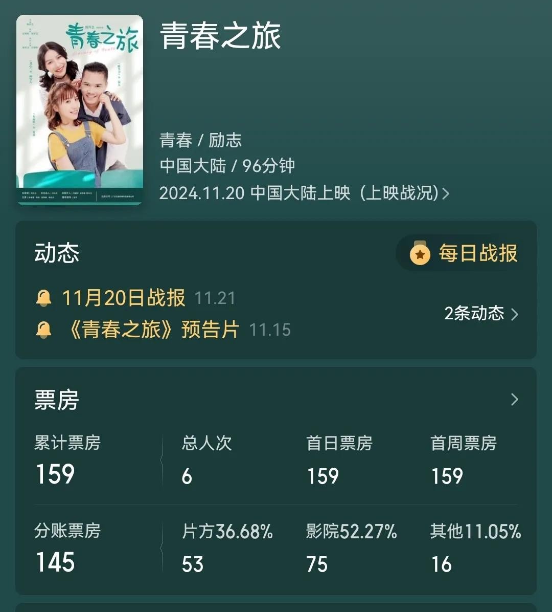 高票房年年有,低票房月月有,万万没想到的是,11月院线电影,高票房没有出现,反而整出一部超低票房的影片来,直接刷新我们对票房都认识。这部电影叫《青春之旅》,属于青春、励志类型,于11月20日上映。截至11月26日晚间,累计票房才有159元。
