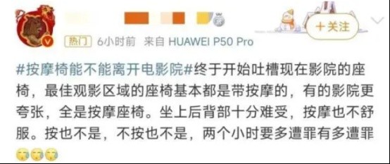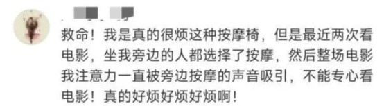 电影院的按摩椅有人喜欢,有人不太喜欢,有网友建议电影院可以单独设置按摩影厅或是线上选座标注按摩座位,让网友能自由选择。