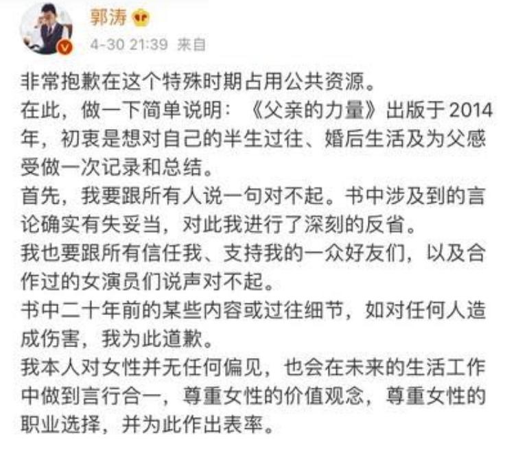 然而在2020年时郭涛却因曾经写的一本自传《父亲的力量》中一些不尊重女性的言论,书中诟病女演员和打女演员的经历,让郭涛深陷入舆论的漩涡,好口碑一夜之间倾倒。