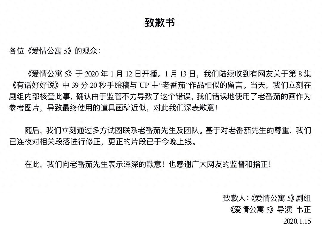《爱情公寓5》官博及导演韦正发表道歉声明,承认剧中画作抄袭