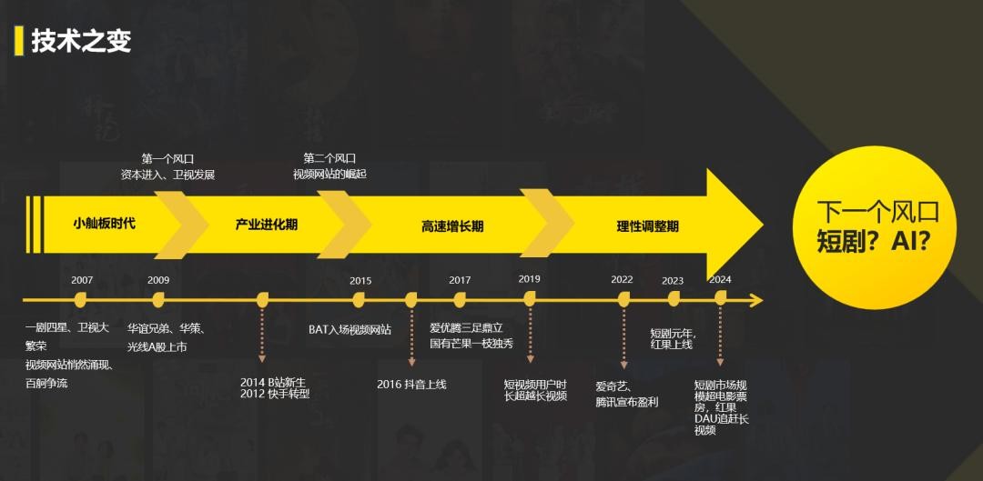 回顾过去,从2007年到2015年,剧集行业经历了不同的发展阶段。2015年后,视频网站的高速发展带动了长剧市场的爆发。而随着抖音在2016年的上线,短视频开始迅速占领市场,给整个行业带来新的挑战。