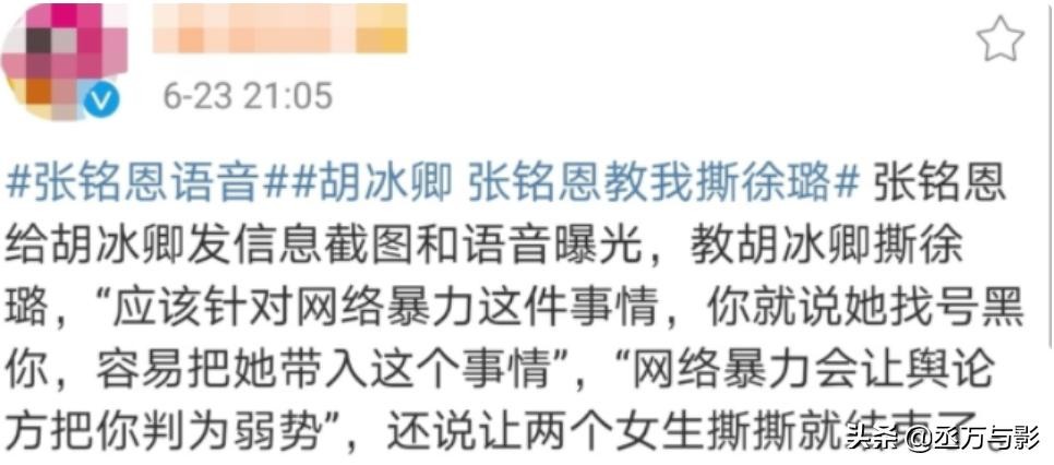 还未等这个风波过去,张铭恩教唆胡冰卿发徐璐黑稿,转移视线一事被曝光,吃瓜群众们直呼好一个心机男。
