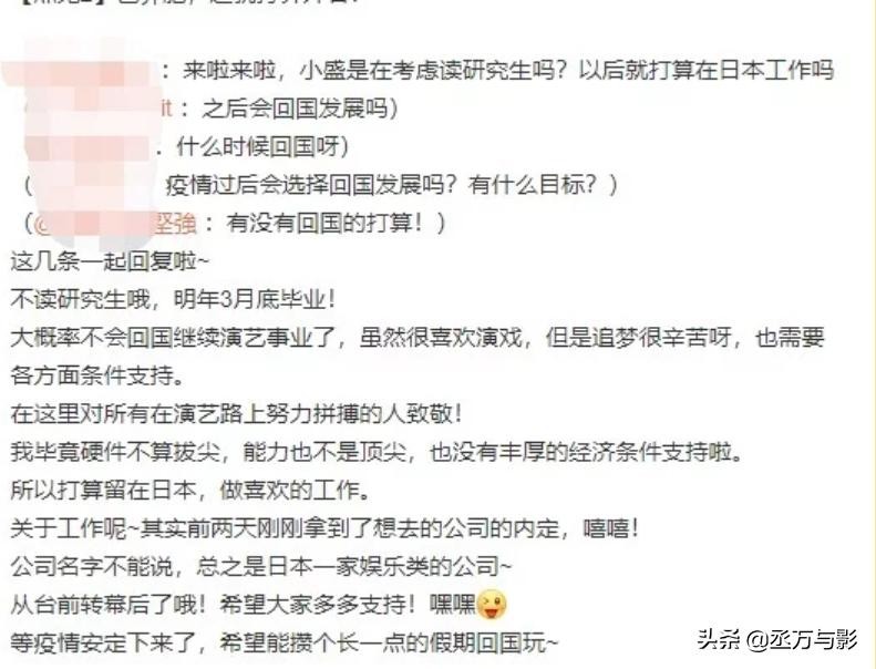 对于老影迷们,盛利大方地告诉了他们自己的计划。她表示自己已经在日本有了稳定的工作,不会再次进入娱乐圈,也大概率不会回国。从台前转到幕后,综合现状来看这是一个明智的选择。