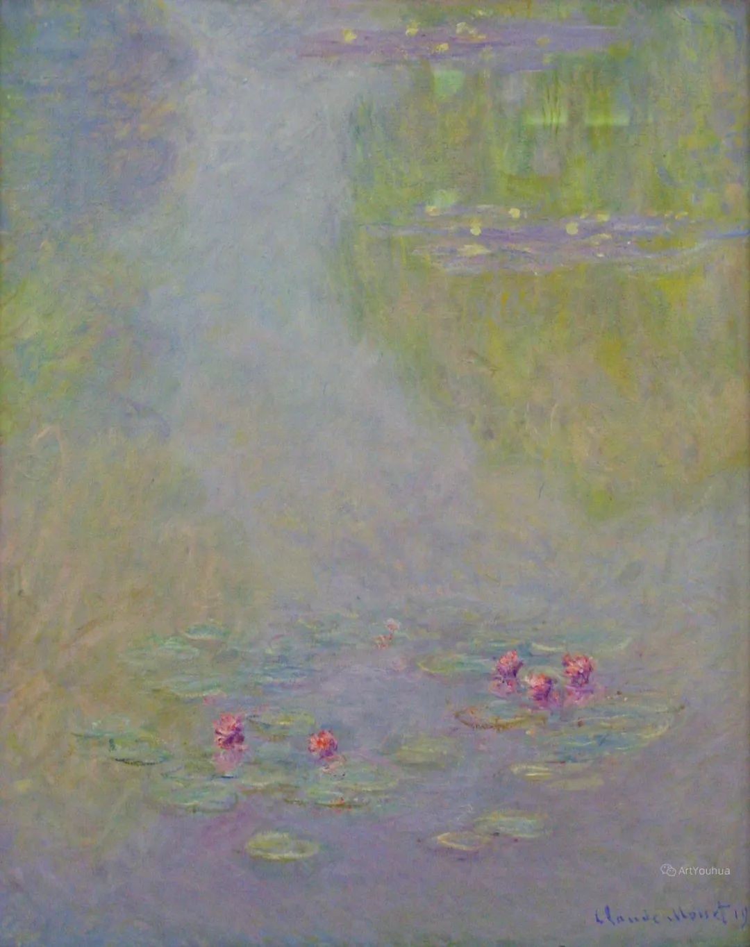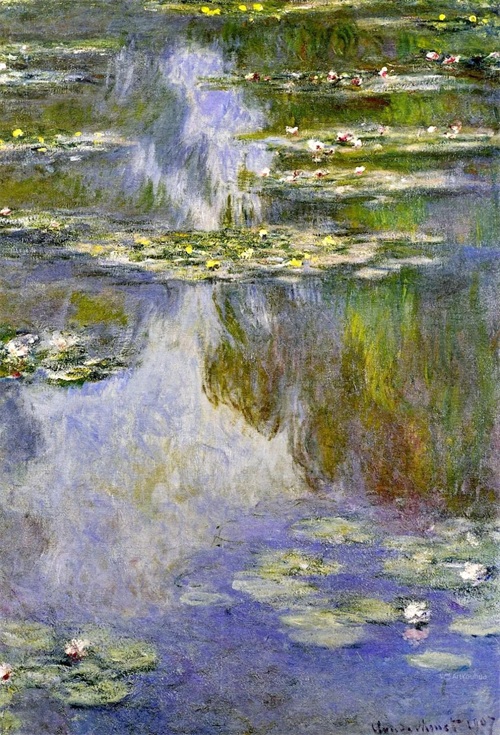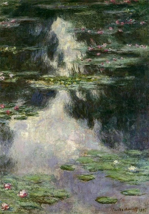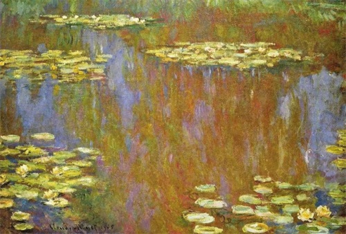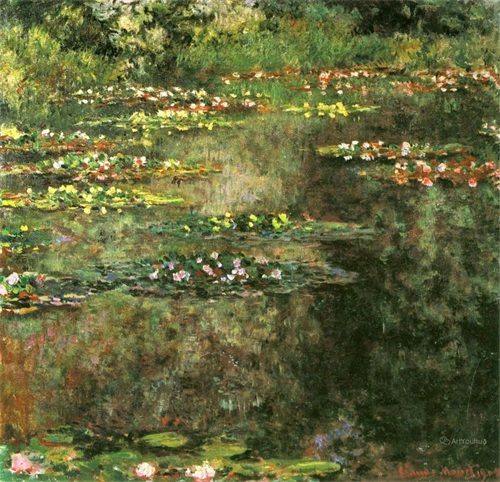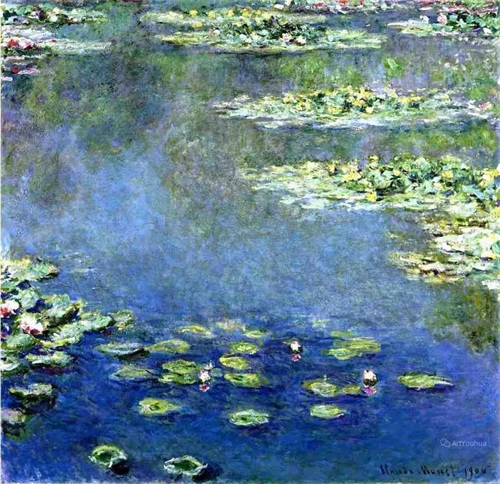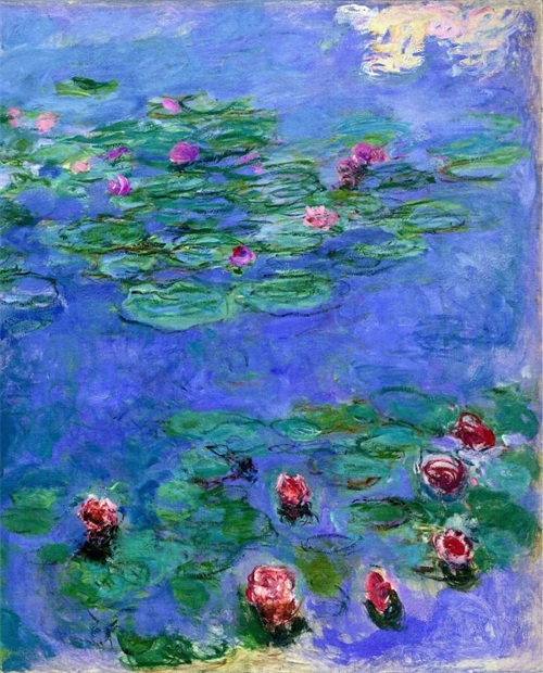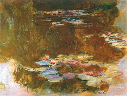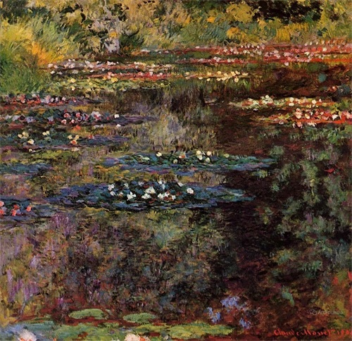 莫奈晚年最重要的一件作品是连作《睡莲》。这是一部宏伟史诗,是他一生中最辉煌灿烂的“第九交响乐”。1880年之后,莫奈与印象派的其他画家们疏远了,他在吉维尼造了一座小花园,住在里面作画。他喜欢把水与空气和某种具有意境的情调结合起来,这样产生了《睡莲》组画。沿着水面,美丽的睡莲一片片向湖面远处扩展开来,画家利用了树的倒影,衬托出花朵的层次,是十分有创造性的构思。莫奈把整个身心都投在这个池塘和他的睡莲上面了,睡莲成了他晚年描绘的主题。此后27年里,他几乎再也没有离开过这个主题。