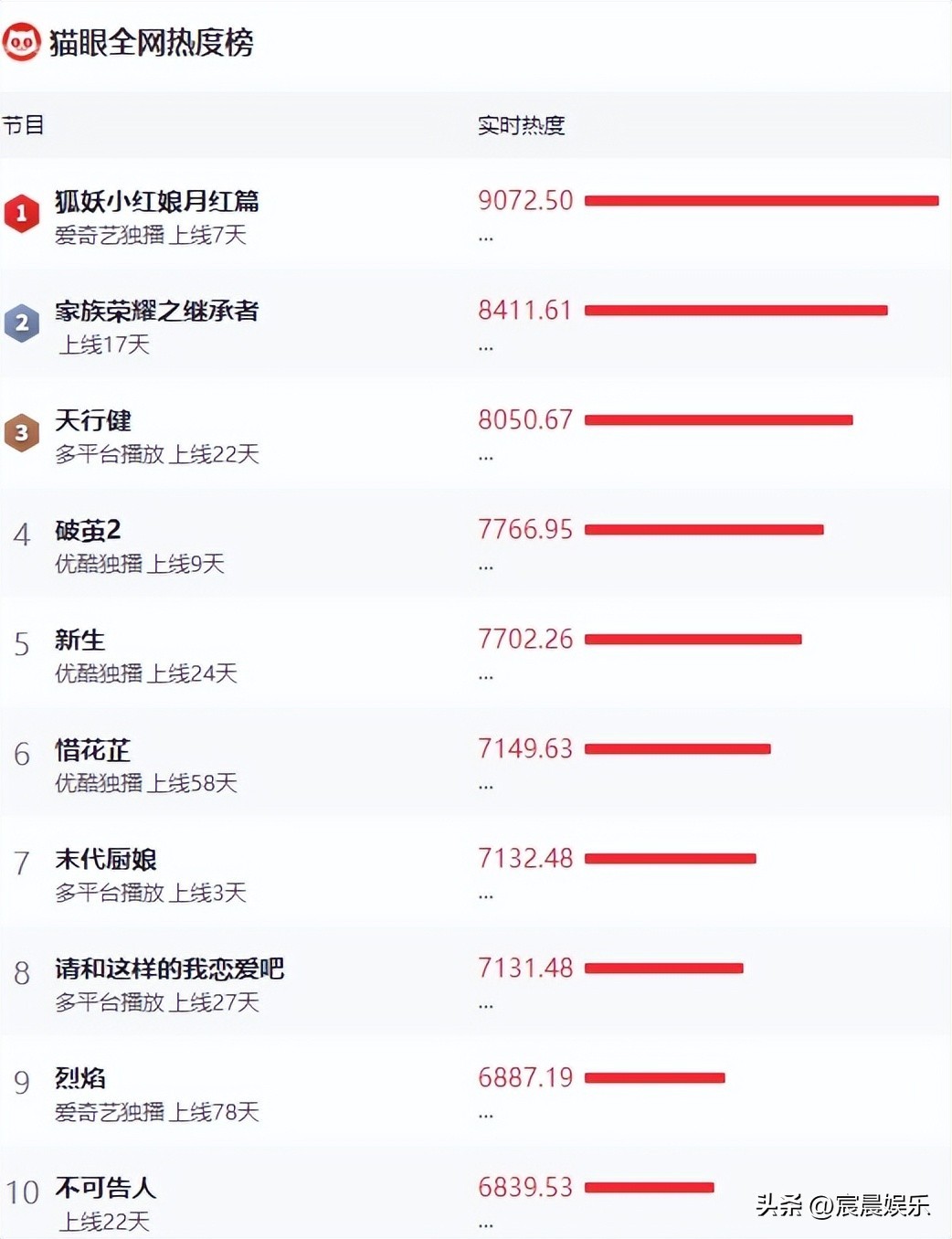 第一名,《狐妖小红娘·月红篇》,播出平台为爱奇艺独播。该剧是由麦贯之、杜林执导,杨幂、龚俊领衔主演,郭晓婷、魏哲鸣、胡连馨、温峥嵘特别主演,祝绪丹、杨仕泽、陈瑶、茅子俊、陈都灵特别出演的古装跨爱结缘剧。该剧根据庹小新创作的连载于腾讯动漫的漫画《狐妖小红娘》改编,讲述了涂山狐族心怀大义的当家涂山红红与东方家后人东方月初相遇,并渐渐相爱的故事。