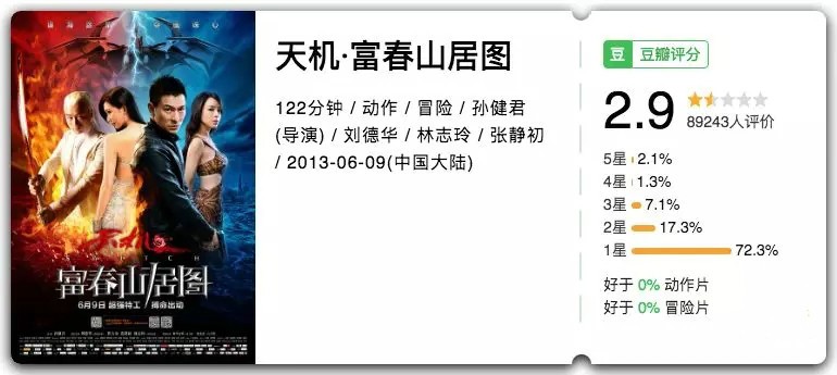 张静初在采访里直言不讳地说自己在过去的十年里,赶上了一些“很奇怪”,甚至是“真的不好的电影”,烂片界的奇葩《天机·富春山居图》大概就是其中的代表了。