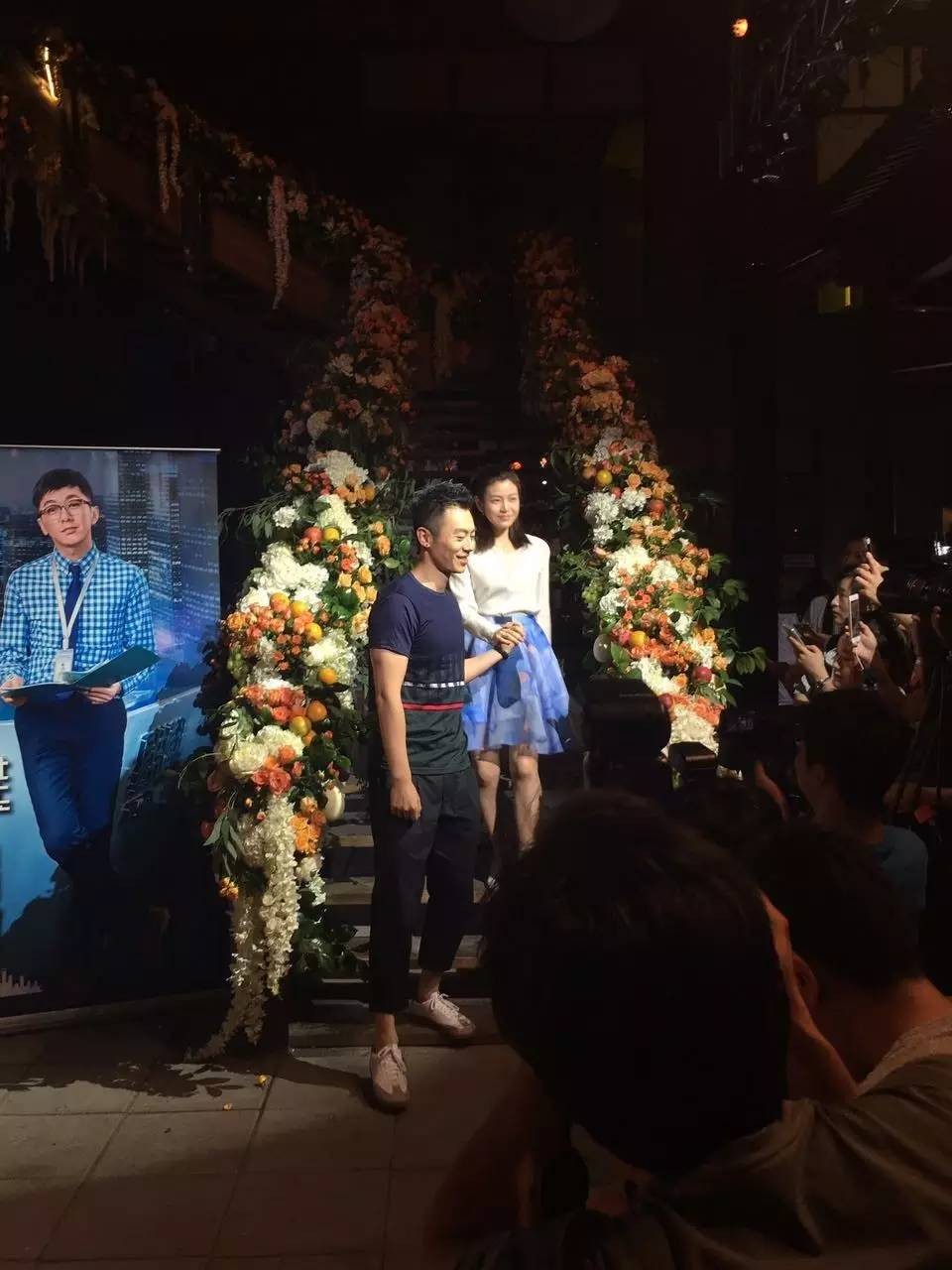 在和这两位对手大聊特聊之后,我们的男女主角终于登场了,在鲜花楼梯的浪漫氛围下,朱亚文牵着陈妍希的手从上面缓缓走下,那种和谐的气氛哟,感觉空气都是粉红色的呢,谁能想象得到如此和谐的两个人,在剧中却是经常吵架斗嘴、针锋相对呢~