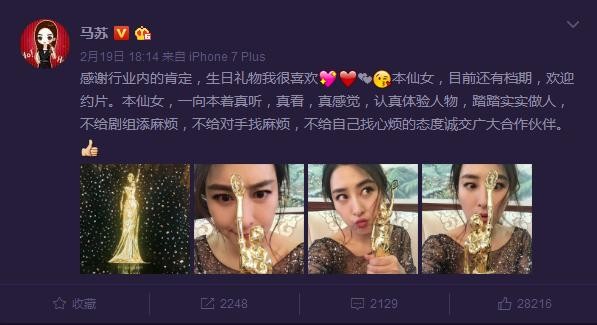 该微博发出后立刻引来网友称赞, “你获奖真是实至名归”“好戏要用好演员,马苏就是好演员”。