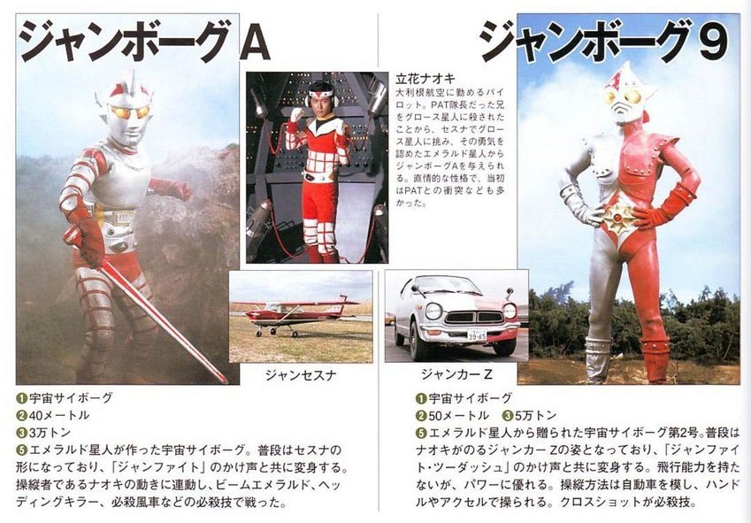 从图片中我们可以看到詹伯A在变身前可以像变形金刚一样伪装成赛斯纳飞机Jenses,而詹伯奈在变身前伪装成本田z汽车。它们都是安莫伦星人造的宇宙机器人,驾驶员是作为飞行员的立花直树。